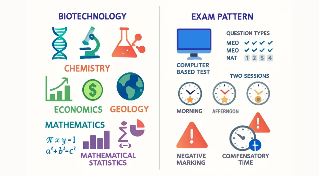 There are seven subjects in JAM 2026 – Biotechnology, Chemistry, Economics, Geology, Mathematics, Mathematical Statistics, and Physics.